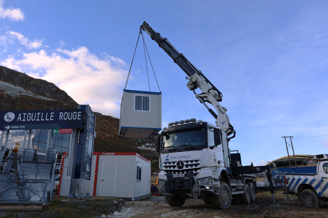 Für die Reparatur der Lifte waren Antoine und sein Arocs auf den Pisten des berühmten Ferienortes Tignes in Savoyen unterwegs - genauer gesagt auf einer Höhe von 2.726 Metern. Die Aufgabe war das Entfernen einer Liftstationsanlage vor der Eröffnung der Wintersaison. Kein Problem für den Truck: Die Ladung ist zwar leicht, allerdings war die Zufahrt zum Gelände aufgrund von heftigen Regenfällen, die das Gelände sehr rutschig gemacht hatten, erschwert: Antoine Apertet stattete den Arocs für diesen Anlass mit Ketten auf allen Rädern aus. Um seine herausfordernden Aufgaben zu meistern, ist der 6x6 Arocs 3351 bestens gerüstet.