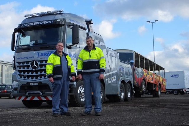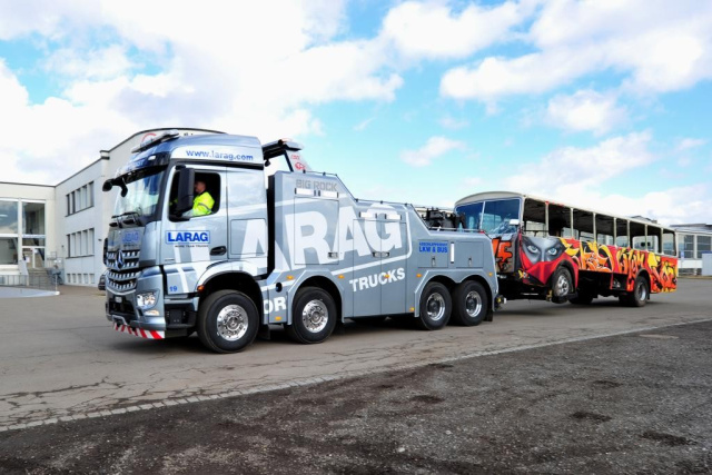 Mit dem Mercedes-Benz Arocs 4451 BIG ROCK ist seit Kurzem das modernste Abschlepp- und Bergefahrzeug der Schweiz für Lkw, Busse und Reisemobile im Einsatz. Die offizielle Mercedes-Benz Vertretung LARAG Fahrzeugwerke AG in Wil leistet mit dem Spezialfahrzeug professionelle Pannen- und Unfallhilfe im Schwerlastbereich und wickelt Überführungsfahrten ab. Der Arocs ist ein 375 kW (510 PS) starker Vierachser. Das neue Abschlepp- und Bergefahrzeug BIG ROCK ist die perfekte Ergänzung, um unseren Service zu komplettieren, erklärt Betriebsleiter Walter Oertli von der LARAG AG.