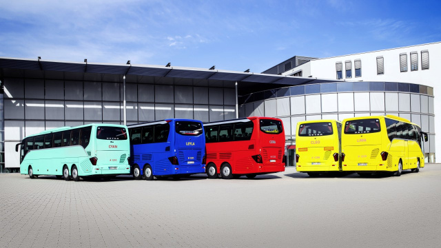 Man kann ihnen im eisigen Winter Finnlands begegnen, auf steilen Straßen in den Bergen der Sierra Nevada, in der feuchten Hitze Gibraltars, auf Rundstrecken in Europa und bei Dauerlauftests in der Türkei, sogar in einer staubigen Kiesgrube: Überall dort ist zurzeit ein halbes Dutzend leicht getarnter neuer Setra Reisebusse unterwegs. Die Hochdecker und Superhochdecker haben zum Teil eine bunte Lackierung sowie eine Beklebung mit Fantasienamen wie Cleo, Leyla, Lima oder Zera – die Namen der ausgewählten Farben.