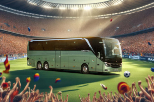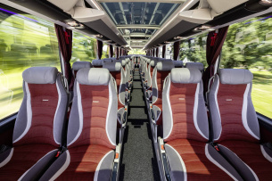 Das Maß der Dinge beschreibt ebenfalls der geräumige und ebenso luxuriös wie durchdacht ausgestattete Fahrgastraum. So heißt der Setra Superhochdecker seine Passagiere mit einem hinterleuchteten Markenschriftzug in der Einstiegsleiste an Tür eins willkommen. Ein Bodenbelag im Holzdekor Harmonia Rosewood, 48 Sitze Setra Voyage Ambassador mit Sitz- und Lehnflächen im Stoff Gecko Amarena, verstellbare Kopfstützen in grauem Composition-Bezug, Seitenwangen und Rückenlehnen in Eisengrau, dazu hellbraune Vorhänge: Das wirkt edel und dynamisch zugleich – vor allem in Verbindung mit dem markentypischen Glasdach TopSky Panorama. Das Multimediasystem Coach Infotainment series, große Monitore in HD-Qualität sowie USB- und 230-Volt-Steckdosen sichern die Information und Unterhaltung an Bord.