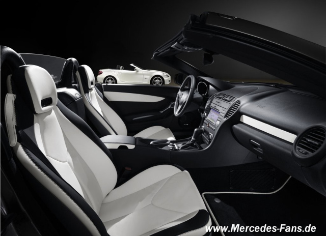 Auch im Interieur des neuen SLK 2LOOK Edition bestimmt ein schwarz-weißes Kontrastprogramm das Bild. Die Sportsitze sind mit Nappaleder bezogen die Sitz-mittelfelder in Weiß, die schwungvollen Sitzwangen in Schwarz. Türen und Mittelarmlehne zeigen ebenfalls schwarz-weiße Kontraste in edlem Leder. Prägnante, handwerklich fein ausgeführte Ziernähte an allen Leder-teilen betonen den spannungsvollen Charakter des Sondermodells.
