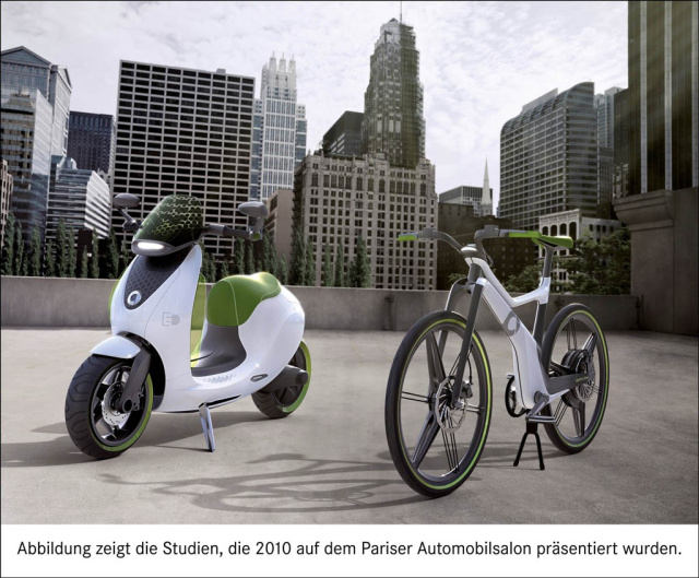 Bereits auf dem Pariser Autosalon 2010 hatte smart ein umfassendes elektrisches Produktportfolio für den urbanen Verkehr vorgestellt. Neben dem smart fortwo electric drive als Coupé und Cabrio besteht es aus dem smart ebike und dem escooter. Konsequent lässt smart dieses Konzept nun Realität werden: Der smart fortwo electric drive wird im Sommer 2012 auf den Markt kommen, die Auslieferung des ebikes beginnt gerade. Der vollelektrische escooter wird innerhalb der nächsten zwei Jahre Premiere feiern. Das Design der escooter-Studie wird nochmals weiterentwickelt. Durch viele innovative und zukunftsweisende Features wird das neue Produkt aber unverkennbar ein echter smart werden. Genau wie das ebike wird der escooter als smart auf zwei Rädern auch für Kunden zur Verfügung stehen, die (noch) keinen Autoführerschein besitzen.