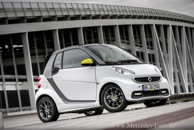 Außen findet sich der markante Gelbton an den Spiegelkappen sowie den Nabenabdeckungen der Leichtmetallräder (Dimensionen: 155/60 R 15 vorn, 175/55 R 15 hinten). Die Bodypanels sind in Kristallweiß matt lackiert, die tridion-Sicherheitszelle ebenso wie die Leichtmetallräder hingegen in Anthrazit glänzend. Edition-Logos in den Spiegeldreiecken sind ein weiteres Erkennungszeichen. Der smart fortwo edition BoConcept basiert auf der Ausstattungsline passion. Daher bringt er serienmäßig unter anderem das automatische Schaltprogramm softouch, elektrische Fensterheber, Klimaanlage mit automatischer Temperaturregelung sowie ein Panoramadach mit Sonnenschutz mit. Auf Wunsch erhältlich sind eine elektrische Servolenkung, Sitzheizung, ein abschließbares Handschuhfach, das smart Soundsystem mit fünf Lautsprechern sowie weitere Sonderausstattungen.