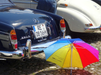 Nach einem gemütlichen Beisammensein in den verschiedenen Lokalitäten der Region ging ein warmer Tag viel zu schnell zu Ende. Der Samstag sollte aber nicht kühler werden. Zunächst trudelten die Nachzügler ein und ein Teilemarkt für alle Anforderungen von Mercedes-Fans öffnete nur wenig später seine Stände. Die Anordnung rund um das Hotel stieß zunächst nicht auf breite Zustimmung... aber mit jedem Sonnenstrahl und dem Schattenwurf des alten Baumbestandes wurden die Teilehändler versöhnlicher.