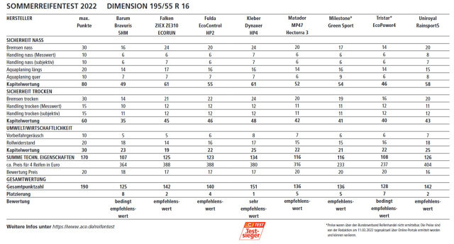 Das Ergebnis: Der Kleber Dynaxer HP4 (Ergebnis: „sehr empfehlenswert") hat im Test eindeutig die Nase vorn, dicht gefolgt von einem Großteil des Testfelds (5 x „empfehlenswert“) Überraschend auch der Milestone, der etwas besser abschneidet als der Tristar und ein gutes Preis-Leistungs-Verhältnis bietet. Zwei Reifen zwei sind nur „bedingt empfehlenswert“. Durchgefallen ist keiner der getesteten Reifen. Die Ergebnisse im Detail zeigt die nachstehende Grafik.
