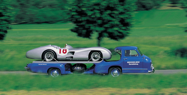 Der 300 SLR Rennsportwagen (W 196 S) in der besonderen Ausführung mit „Luftbremse“ erinnert an den Gewinn der Sportwagen-Weltmeisterschaft 1955. Der 300 SL „Gullwing“ (W 198) schließlich ist Zeitzeuge der Rennerfolge mit Seriensportwagen. Besondere Einzelstücke sind das 300 SLR „ Uhlenhaut-Coupé“ und der Rennwagen-Schnelltransporter. Das 1955 entwickelte Coupé des W 196 S ist für Wettbewerbe in der Saison 1956 vorgesehen. Es kommt aber aufgrund des Ausstiegs der Stuttgarter Marke aus dem Motorsport zum Ende der Saison 1955 nicht mehr zum Einsatz. Berühmt wird es als sportlicher Dienstwagen von Rudolf Uhlenhaut, damaliger Versuchschef von Daimler-Benz. Der Rennwagen-Schnelltransporter mit dem Spitznamen „Das blaue Wunder“ entsteht für besonders eilige Transporte zwischen Werk und Rennstrecken in der Saison 1955.
