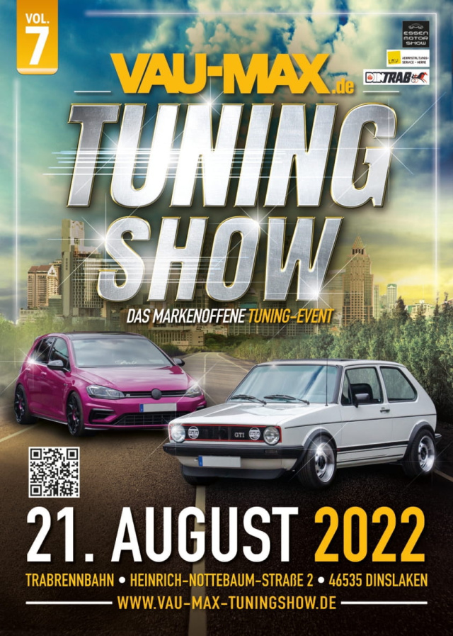 Der Termin für die 7. VAU-MAX TuningShow steht! Diese findet am 21. August 2022 statt. Als Location wird in diesem Jahr die Trabrennbahn DinTrab in Dinslaken dienen.