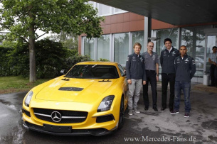 So einen Besuch hat man gerne auf der Matte: Die MERCEDES AMG PETRONAS Formel 1-Fahrer Nico Rosberg und Lewis Hamilton sowie Mercedes-Benz Motorsportchef Toto Wolff stimmten sich und ihre Mercedes-Benz Kollegen am Mittwoch, 3. Juli 2013 mit einem Besuch im Mercedes-Benz Werk in Sindelfingen auf den Großen Preis von Deutschland ein. Das deutsche Heimrennen des Silberpfeil-Teams findet vom 5. bis 7. Juli auf dem Nürburgring statt. Im Rahmen des Werksbesuchs standen Rosberg, Hamilton und Wolff in Sindelfingen den Mercedes-Benz Mitarbeitern Rede und Antwort, besichtigten die Produktionsanlagen der neuen Mercedes-Benz S-Klasse und überraschten zwei Kunden bei der Übergabe Ihres neuen Fahrzeugs im Mercedes-Benz Kundencenter.