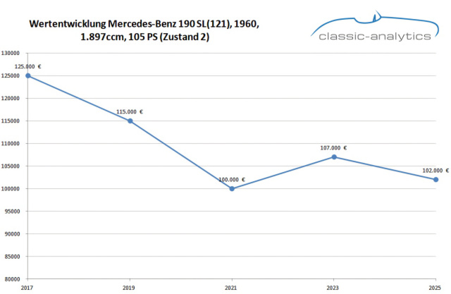 Laut den Spezialisten von Classic-Analytics ist der durchschnittliche Wert eines Mercedes-Benz 190 SL (W121) in den letzten acht Jahren stark gesunken. Während der Roadster in der Zustandsnote 2 im Jahr 2017 noch ca. 125.000 Euro gekostet hat, liegt der Preis nunmehr bei 102.000 Euro. Eine sichere Geldanlage sieht anders aus. Warum ist der Wert des 190 SL so stark zurückgegangen?