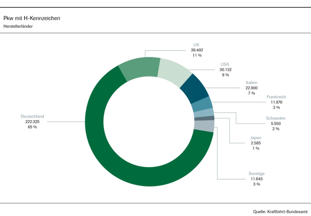 Der Bestand historischer Fahrzeuge in Deutschland ist im vergangenen Jahr erneut gewachsen. Zum 1. Januar 2016 waren 343.958 Pkw mit H-Kennzeichen gemeldet, das sind 10,7 Prozent mehr als im Vorjahr. Die Gesamtzahl aller historischen Kraftfahrzeuge mit H-Kennzeichen – dazu zählen neben Pkw auch Nutzfahrzeuge, Zugmaschinen und Motorräder – liegt bei rund 388.000.