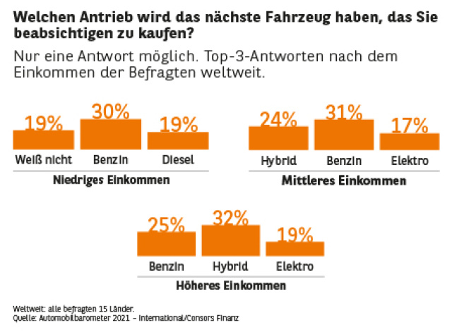 Für Haushalte mit mittleren Einkommen ist der Erwerb eines Elektro- oder Hybridwagens schon eher eine Option. Bereits 24 Prozent weltweit beabsichtigen, einen Hybrid und jeder Sechste ein reines Elektroauto anzuschaffen. 31 Prozent bleiben beim Benziner. In Deutschland würde sich hingegen weiterhin knapp die Hälfte der Befragten mit mittlerem Einkommen für einen Benziner entscheiden, nur 18 Prozent einen Hybrid und 14 Prozent ein Elektroauto.
