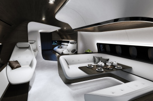 Das Interieurkonzept geht völlig neue Wege abseits der bekannten Gestaltung von Flugzeuginnenräumen. Die Innenausstattung kleidet wie eine DNA-Helix organisch und homogen die Kabine aus. Boden, Wand und Decke gehen fließend ineinander über. Die Möbel fügen sich mit ihrem sinnlich-klaren Design nahtlos in das Kabineninterieur ein und sind mit zahlreichen innovativen Detaillösungen umgesetzt. Die Kabinenfenster werden durch vorgesetzte Glasscheiben, sogenannte Black Panels, verdeckt. Sie scheinen wie eine Lichtkorona vor den Fenstern zu schweben und sind durch das Screendesign der Mercedes-Benz S-Klasse inspiriert. Dank der innovativen Mercedes-Benz Magic-Sky-Technologie lassen sich die Glasscheiben elektrisch von schwarz zu transparent dimmen. Bildschirme und Touch Screens für Unterhaltung und Information können problemlos in die Black Panels integriert werden. Die beiden Unternehmen werden gemeinsam in den nächsten Monaten das allgemeine Kundeninteresse am VIP-Markt evaluieren sowie die Detaillierung des Designkonzeptes weiterentwickeln.