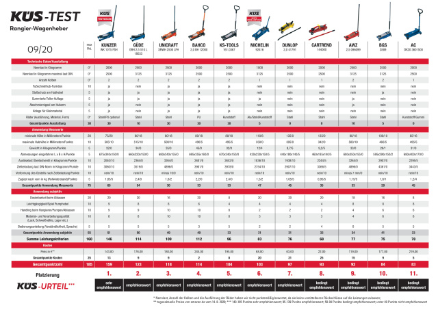 Mit teilweise deutlichen Unterschieden bei Qualität, Preis und Leistung aber dennoch „empfehlenswert" sind die Rangierwagenheber von Güde (176 €), Unicraft (180 €), Bahco (245 €), KS-Tools (195 €), Michelin (68 €) und Dunlop (63 €). Im Test lediglich „bedingt empfehlenswert" die Produkte von Cartrend (22 €), AWZ (119 €), BGS (177 €) und dem recht teuren „Schlusslicht" AC (219 €).