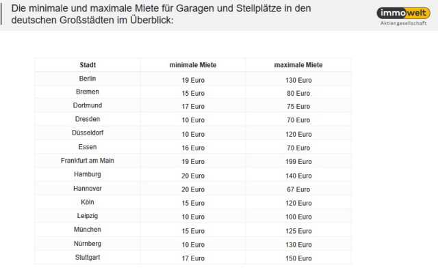 Hinter Frankfurt folgt mit großem Abstand Stuttgart mit einer Spanne von 17 Euro bis zu 150 Euro. Auch hier gilt: Die preiswerten Stellplätze befinden sich eher am Stadtrand, in Stuttgart Mitte müssen 100 Euro und mehr eingeplant werden. Auch Hamburg, wo die Mieten bis zu 140 Euro kosten, sowie Berlin und Nürnberg mit Spitzenpreisen von jeweils 130 Euro zählen beim Parken zu den teuersten Großstädten. München, das bei Wohnungspreisen mit großem Abstand am teuersten ist, liegt bei den Stellflächen auf einem ungewohnten Mittelfeld-Platz: Selbst in den innenstadtnahen Lagen wie Ludwigsvorstadt-Isarvorstadt oder Au-Haidhausen kosten Garagen mit 125 Euro deutlich weniger als in Frankfurt oder Stuttgart. Die günstigsten Stellplätze werden in der bayerischen Landeshauptstadt schon für monatlich 15 Euro angeboten.