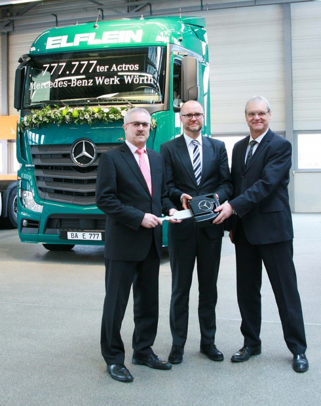 Helmut Bachmann, Leiter Produktion Fahrzeuge Mercedes-Benz Werk Wörth, mit Rüdiger Elflein, Geschäftsführer Elflein Spedition & Transport GmbH, und Thomas Witzel, Mitglied der Geschäftsleitung des Mercedes-Benz Vertrieb Deutschland, verantwortlich für den Vertrieb Lkw, bei der Übergabe des 777.777sten Actros im Werk Wörth (v.l.n.r.).