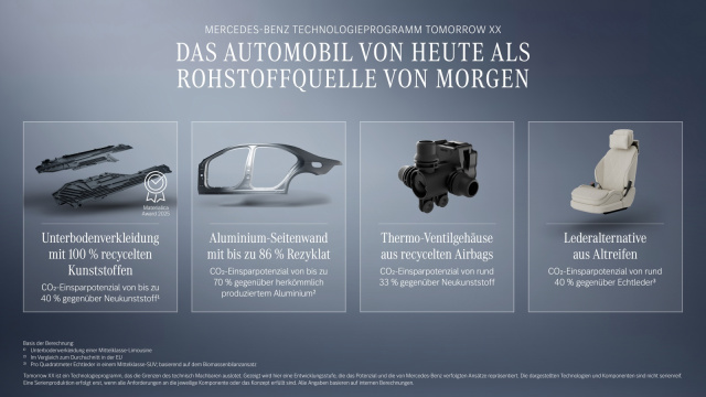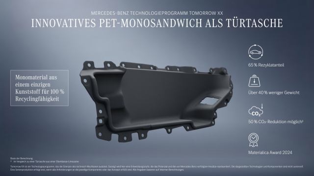 Großes Potenzial sieht Mercedes-Benz in Monomaterialien. Ein innovatives PET-Monosandwich reduziert etwa den CO₂-Fußabdruck einer Türtasche um 50 Prozent und wurde bereits ausgezeichnet. Auch Teppiche und Fußmatten sollen künftig vollständig aus recyceltem PET bestehen. Gleichzeitig steigt der Einsatz von Pre- und Post-Consumer-Rezyklaten, etwa in Wischwasserbehältern oder Stoßfängern.