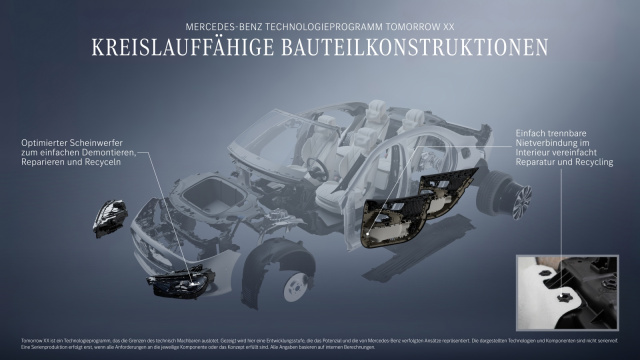 Mit Tomorrow XX präsentiert Mercedes-Benz ein umfassendes Technologieprogramm, das eine neue Stufe nachhaltiger Fahrzeugentwicklung einläutet. Aufbauend auf dem interdisziplinären Ansatz der Konzepte VISION EQXX und CONCEPT AMG GT XX wird das Programm erstmals über die gesamte Modellpalette hinweg ausgerollt. Im Zentrum stehen Dekarbonisierung, Kreislaufwirtschaft und maximale Ressourceneffizienz – von der ersten Skizze bis zum Ende des Lebenszyklus eines Fahrzeugs. Dazu kooperiert Mercedes-Benz eng mit Lieferanten, Forschungseinrichtungen und Start-ups, um über 40 neue Material- und Bauteilkonzepte in die Serienentwicklung zu überführen.