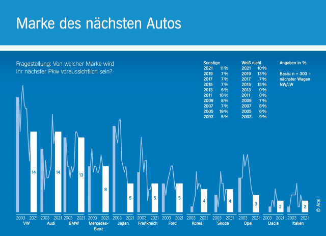 Laut der am 25. August 2021 veröffentlichten repräsentativen Aral Studie "Trends beim Autokauf 2021" können sich 40 Prozent der Autofahrer vorstellen, sich in den nächsten anderthalb Jahren ein neues Auto zuzulegen. Vor zwei Jahren waren es noch 35 Prozent. Dabei müssen Preis und Wirtschaftlichkeit stimmen, genauso wie der Komfort. Und auch die Umweltfreundlichkeit spielt eine immer größere Rolle. Und welche Marken möchten die Deutschen am liebsten fahren? Ganz oben in der Gunst der Kaufinteressenten stehen Audi und Volkswagen mit einer Zustimmungsquote von jeweils 14 Prozent. Für BMW reicht ein kleiner Rücksetzer von 14 auf jetzt 13 Prozent im Vergleich zur 2019er Studie, um die Pole-Position einzubüßen. Hinter dem Spitzentrio folgt Mercedes - allerdings schon mit einem deutlichen Rückstand. Ehemalige Volumenmarken wie Ford und Opel liegen inzwischen auf dem Niveau von Skoda und Tesla.