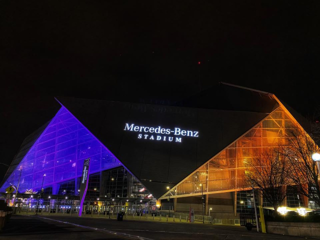 Das Mercedes-Benz Stadium in Atlanta nahm den tragischen Tod von Kobe Bryant zum Anlass, auf eigene Art Trauer zu tragen. Aber nicht in schwarz, sondern in Purple und Gold - den farben des LA Lakers - war die Veranstaltungsarena illuminiert - so wie viele große Bauten und Gebäude in den USA es zum Zeichen der Trauer es taten. (Bilder: Screenshot CBS LA / Mercedes-Benz Stadium Atlanta)
