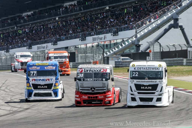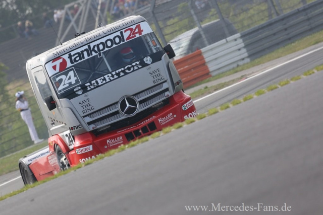 Das Drumherum ist aber auch absolut einmalig. In Le Mans oder Jarama gibt es auch Massen von Zuschauern, aber am Ring gibt es eben diese einzigartige Mischung aus Rennen und Trucker Festival mit Musik und Feuerwerk. Jeder der im Truck Business was auf sich hält ist hier und denkt sich für die Zuschauer etwas besonderes aus. Auch wir haben mit der Päsentation unseres Songs Unbelievable Power von Mum`s best (www.mumsbest.de) was zu bieten. Mum und ihre Jungs spielen sich drei Tage lang die Finger wund und immer wenn ich mit dem Truck auf die Rennstrecke fahre, verabschieden sie sich mit `unserem` Lied. Das ist Motivation pur und beim zweiten Rennen des Tages wirkt sich dieser Ansporn auch in einem Ergebnis aus.
