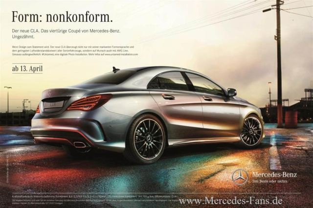 Die Printmotive der Anzeigen zeigen den Mercedes CLA als Stil-Rebellen aus verschiedenen Perspektiven. Sie werden bis Mitte April mit Schlagworten wie Form: nonkonform oder Ungezähmt in auflagenstarken Nachrichten- und Wirtschaftsmagazinen, der Motorfachpresse und Special-Interest-Medien geschalten.