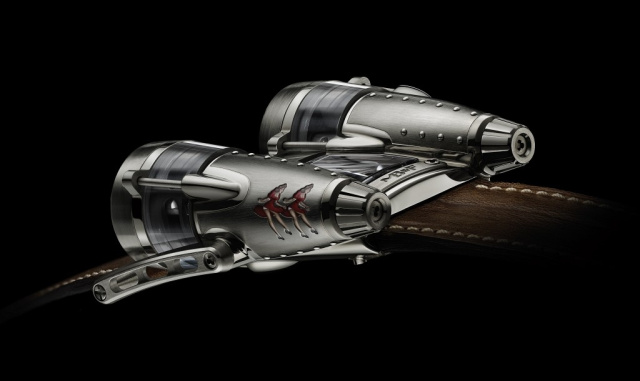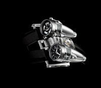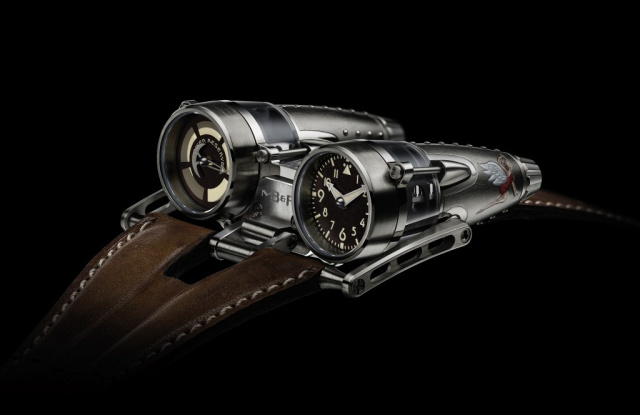 Die limitierten Modelle HM4 Razzle Dazzle und Double Trouble verstärken das Luftfahrtthema noch durch die Verzierung des Gehäuses mit echten Nieten und handgemalten Kunstwerken auf den Rümpfen. Die kecken Bilder interpretieren die sogenannte Nose Art der Militärflugzeuge im Zweiten Weltkrieg. Dagegen entspricht die Horological Machine No.4 RT (Rotgold/Titan), das neueste Modell dieser Reihe, eher der modernen, luxuriösen Variante einer Flugreise.