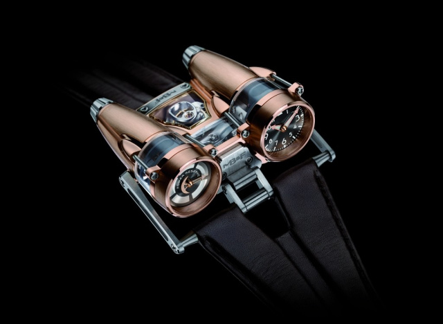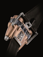 Die aerodynamische Form des Titan-Saphir-Gehäuses kommt nicht von ungefähr: Maximilian Büsser baute in seiner Kindheit mit großer Leidenschaft Flugzeugbausätze zusammen und hat nun im Erwachsenenalter die Formensprache der Modellflugzeuge in einem Zeitmesser umgesetzt. Der wirkt noch deutlich futuristischer als seine Vorbilder, was nicht zuletzt auch am Material und dessen Bearbeitung liegt. Das transparente Gehäusemittelteil ist ein Kunstwerk für sich. Mehr als 185 Bearbeitungsstunden braucht es, um aus einem massiven milchigen Glasblock ein vollkommen transparentes, komplex geformtes Schaufenster für die Mikromechanik zu machen.