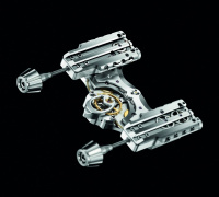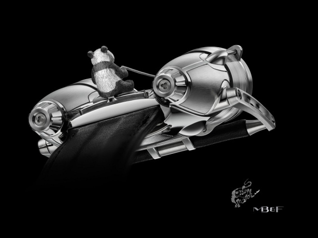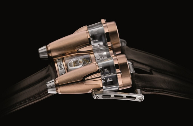 Die Maschine, so nennt man bei MB&F das Uhrwerk, ist das Ergebnis von rund drei Jahren Entwicklungsarbeit. Jedes der mehr als 300 Einzelteile inklusive Gangregler und sogar der Schrauben wurde ganz speziell für dieses anarchistische Uhrwerk entwickelt. Zwei parallel geschaltete Federhäuser geben ihre Kraft über zwei vertikal angeordnete Räderwerke in die beiden Gehäuseoberteile rechts wird die Zeit angezeigt, links die Gangreserve.