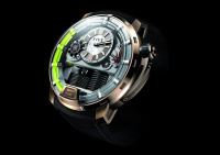Das gespannte, aggressive Design durch Sébastien Perret diktiert den maskulinen Charakter der H1, die imposante 48,8 Millimeter im Durchmesser, und 17,9 mm in der Höhe misst. Gleichsam einer hydro-mechanischen Miniatur-Zeitmaschine präsentiert sich das betont in die Tiefe strukturierte Uhrwerk unter einem 5 mm dicken, aus dem Vollen gefrästen Saphirglas. Im oberen Teil des Gehäuses sitzt das mechanische Kaliber, in dessen Zentrum die Regulator-Minutenanzeige positioniert ist. In die linke Seite ragt die Sekundenanzeige hinein, deren Form unweigerlich an eine Wasserturbine erinnert. Auf der rechten Seite befindet sich bei 2:30 h die Anzeige für die Gangreserve von 65 Stunden mit drei feuerroten Kreisbögen zur Darstellung der verbleibenden Federspannung.