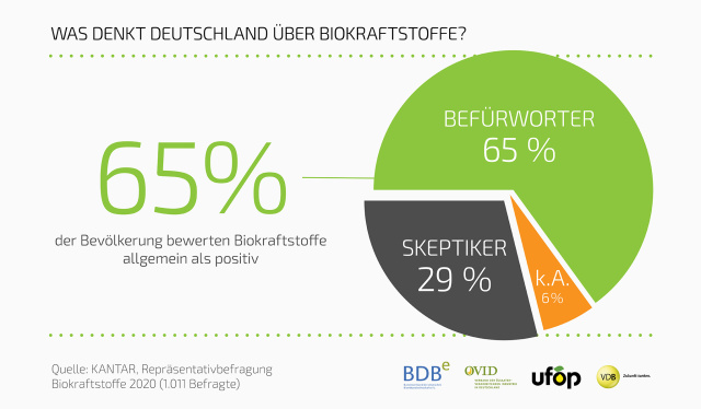 65 Prozent der Deutschen bewerten Biokraftstoffe grundsätzlich positiv. Dies hat eine repräsentative Umfrage des Meinungsforschungsinstitutes Kantar im Auftrag der Biokraftstoffbranche ergeben. Bei einer garantierten Verminderung von mindestens 60 Prozent der Treibhausgase im Vergleich zu Mineralöl sowie nachhaltiger Produktion würden knapp 70 Prozent der Befragten Biokraftstoffe tanken. 43 Prozent aller Befragten rechnen damit, dass Biokraftstoffe im Kampf gegen den Klimawandel an Bedeutung gewinnen werden.