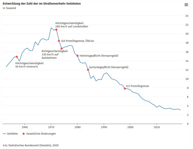 Im Jahr 2019 sind in Deutschland 3 046 Menschen bei Straßenverkehrsunfällen gestorben – das ist der niedrigste Stand seit mehr als 60 Jahren. Wie das Statistische Bundesamt (Destatis) mitteilt, starben 2019 im Straßenverkehr 7 % oder 229 Menschen weniger als im Vorjahr.