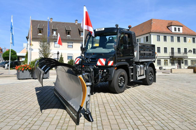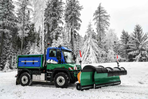 Mit dem Sondermodell U 327 steht außerdem ein vielseitiger Spezialist für Winterdienst und Transport am Stand. Er vereint die Funktionen Schneeräumen, Streuen und Reinigen. Auch für Transporte und Kranarbeiten bietet dieses Modell eine geeignete Plattform. Das Fahrzeug aus der mittelschweren Baureihe ist somit der ideale Begleiter von Kommunen, Lohnunternehmern und Dienstleistern. Unimog ExpertPartner Bucher Municipal hat das Fahrzeug mit einem teleskopierbaren Schneepflug aus der Baureihe Teplex TE 90.30/40S sowie einem Yeti ECO FS 50 Streuautomaten ausgerüstet. Die Räumbreite des Schneepflugs lässt sich hydraulisch stufenlos an die Fahrbahnbreite anpassen. Zudem ist er mit einer Neopren-Räumleiste ausgestattet, die ein oberflächenschonendes und geräuscharmes Räumen bei einer sehr hohen Standzeit ermöglicht. Beim Streuautomaten handelt es sich um einen Yeti W20o mit Doppelförderschnecken-System, bei dem die Anteile von Salz und Sole jeweils 50 % betragen. Für das Exponat bedeutet das ein Trockenstoffvolumen von 2,0 m3 und ein Solevolumen von 2.000 l. Darüber hinaus ist es mit dieser Baureihe auch möglich, reine Sole (FS-100-Streuverfahren) auszubringen.