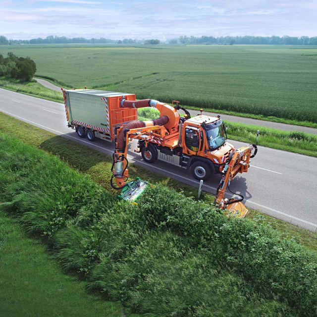 Der U 535, die schwerste und leistungsstärkste Unimog Baureihe, trägt zur Messe Anbaugeräte von Unimog ExpertPartner Mulag. Damit ist er der vielseitige Partner für die anspruchsvolle Grünpflege im Straßendienst. Zum Einsatz kommt an der Frontanbauplatte das Kombinationsmähgerät MKM 700, das aus einem Frontausleger und einem Randstreifenmähgerät besteht. Sein Zweck ist die effiziente Bearbeitung des Intensivbereichs des Straßenbegleitgrüns, also von Flächen wie Banketten, Mulden, Gräben, Trenn- und Mittelstreifen. Am Heck des U 535 ist der Heckausleger SB 600 verbaut, der mit seiner Absaugeinrichtung in der Lage ist, die anfallende Mahd in einem Mähgutanhänger zu entsorgen. Unterschiedliche Arbeitsgerätevarianten ertüchtigen die Auslegergeräte für zahlreiche Aufgaben der Grünstreifenpflege im Sommerdienst. Eine besondere Rolle beim Umweltschutz kommt dem Grünpflegekopf ECO 1200 plus zu. Sein spezielles Schneidwerk erfüllt wissenschaftlich belegt die Anforderungen zum Schutz von Insekten und Pflanzen.
