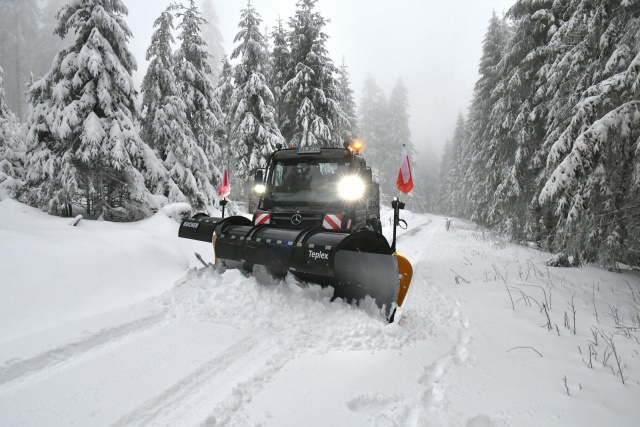 Unimog ExpertPartner Bucher Municipal hat das Fahrzeug mit seinem neuen Flügelschieber-Schneepflug Wingx LN2636t sowie einem Yeti W27 mit VarioMax und wechselbarem Streuteil ausgerüstet.