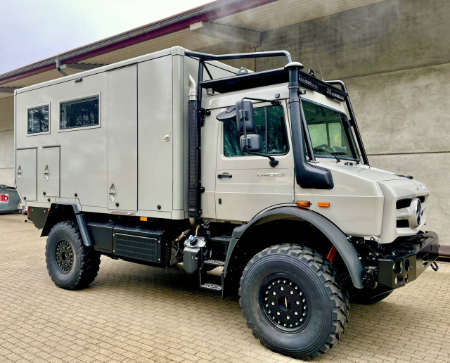 Für die besonders leistungshungrigen Abenteuerreisenden haben die Experten von Mercedes-Benz Special Trucks gemeinsam mit Hellgeth Engineering ein ganz besonderes Fahrzeug auf die Achsen gestellt: einen hochgeländegängigen U5030 mit viersitziger Doppelkabine und Platz für die ganze Familie einschließlich Vierbeiner. Für diese Einzelanfertigung hat der Fahrzeugbauer einen U5023 als Basis gewählt und an die Erfordernisse des leistungsstarken Sechszylinder OM936 angepasst, der hier statt des serienmäßigen Vierzylinders OM 934 in das Fahrgestell eingezogen ist. Der Bolide verfügt damit über 220 kW (299 PS) und ein deftiges Spitzendrehmoment von 1.200 Nm. Um die Kraft zu bändigen, wurden unter anderem Bremsanlage, Achsen und Getriebe angepasst. Im Gegensatz zu den Modellen auf Basis U5023 bändigt beim U5030 ein permanenter Allradantrieb das Drehmoment und verteilt es gleichmäßig an alle Räder weiter. Zudem verfügt dieses besondere Freizeitfahrzeug über einen Hightech-Carbonfaser-Aufbau. Auch dieses Einzelstück verfügt über eine Freigabe von Mercedes-Benz Special Trucks und ist damit ein werksabgesicherter Umbau.