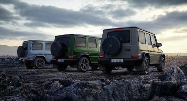 Eine fast grenzenlose Vielfalt an Individualisierungsmöglichkeiten offeriert die G manufaktur. Auch hier finden sich erweiterte Umfänge. So wecken die drei neuen Lackfarben G manufaktur classicgrau uni, G manufaktur tiefgrün uni und G manufaktur chinablau uni Erinnerungen an legendäre Außenfarben aus 40 Jahren G-Klasse. Für das neue Night-Paket magno bietet die G manufaktur zusätzliche schwarze Akzente an: einen in Nachtschwarz magno lackierten Reserveradring sowie Stoßfänger und Radlaufverbreiterungen in der gleichen Farbe. In ausgewählten Ländern ist auch ein Rammschutz in Nachtschwarz magno lieferbar.