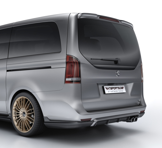 VANSPORTS.DE - VP Spirit Heckschürzenaufsatz (4-teilig) aus ABS Kunststoff, zur Montage unter der original V-Klasse Heckschürze. Achtung! Nur für Fahrzeuge ab Modellpflege 2019 bis 01/2021 (Einführung CU4 Aerodynamikpaket) Nicht geeignet für Fahrzeuge mit AMG Optikpaket oder CU4 Aerodynamikpaket. Eine ausführliche Montageanleitung sowie Montagematerial und ein TÜV Teilegutachten für den Anbau von Fahrzeugteilen nach § 19 (3) Nr.4 StVZO gehören zum Lieferumfang. Alter Preis: 1.505,11 €. Aktionspreis: 1.204,09 € inkl. MwSt., zzgl. Versandkosten.
