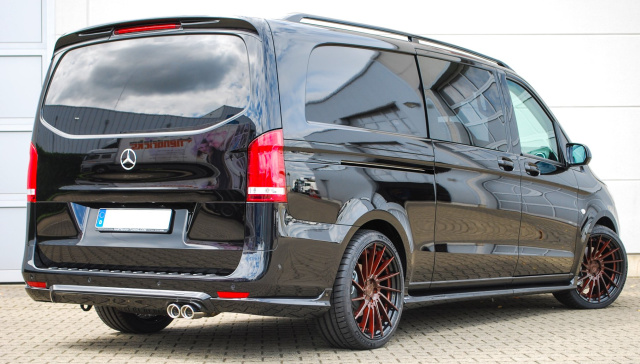 Vorn und im Bereich der Schiebetür ist der Vito luxuriös, hinter der Sitzbank folgt dann noch eine Trennwand mit üppigem Laderaum. Zum Bodykit dieser Tuning- und Styling-Linie für den Mercedes Benz Vito gehört eine sportliche Frontspoilerlippe, Frontschürzeninlays mit LED Beleuchtung, extralange Seitenschweller, eine Heckschürze mit Doppelendrohr-Auspuff sowie ein Dach-Heckspoiler.