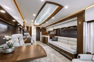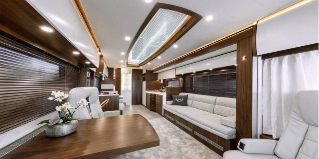 Das Interieur in „bentART“ Design wurde kontrastreich in der Kombination satin-weiß mit amerikanischem Nussbaum Edelholzfurnier von Hand gefertigt. Diese Ausstattungslinie besticht durch sanft gerundete Form und bringt die helle Leder-Wohnlandschaft mit bequemen, elektrisch verstellbaren Captain’s Chairs erst richtig zur Geltung. Das Ambiente des großzügigen Reisemobil-Salons wird durch Relief Strukturmöbelwände interessant ergänzt und stilvoll indirekt beleuchtet. Ein mikroprozessorgesteuertes PLATINUM Lichtsystem sorgt mit Memory-Lichtszenen und diversen Dimmfunktionen für ein stimmungsvolles Ambiente. Auch in den Griffnischen der Türen und Auszüge geben LED-Spots sanftes Licht ab.