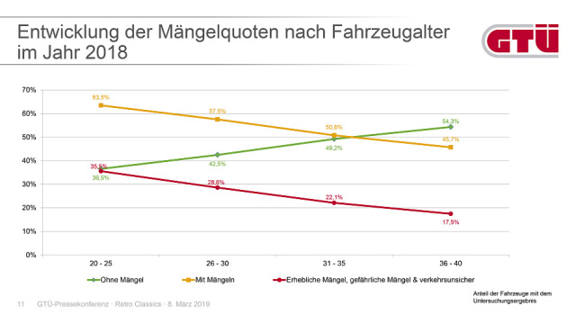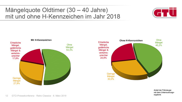Ein völlig anderes Bild geben die Klassiker aus der Vorkriegszeit: Bei den für den Straßenverkehr zugelassenen Oldtimern der Baujahre 1920 bis 1940 sind 81,6 Prozent der Fahrzeuge in meist sehr gepflegtem Zustand und ohne jegliche Mängel. Lediglich 14,9 Prozent der historischen Fahrzeuge aus diesem Zeitraum weisen „geringe Mängel“ auf, bei nur 3,5 Prozent stellten die GTÜ-Prüfingenieure „erhebliche und gefährliche Mängel“ fest.