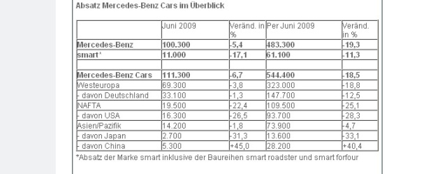 Mercedes-Benz Cars setzte im Juni 111.300 (i.V. 119.300) Fahrzeuge der Marken Mercedes-Benz, AMG, smart und Maybach weltweit ab (minus sieben Prozent). Die Marke Mercedes-Benz lieferte im Juni in einem nach wie vor schwierigen Marktumfeld weltweit 100.300 (i.V. 106.000) Fahrzeuge an Kunden aus (minus fünf Prozent). Damit setzte Mercedes-Benz den positiven Trend des Vormonats fort und konnte den Absatzrückgang im Vergleich zum Mai mehr als halbieren. Hierzu trug der erfolgreiche Anlauf der neuen E-Klasse Limousine bei, die im Juni weltweit die Marktführerschaft behauptete. Zudem verzeichnete Mercedes-Benz eine spürbare Erholung in vielen Märkten Westeuropas und eine anhaltend positive Entwicklung in China.