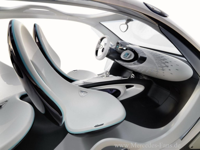Ohne Türen, Heckscheibe und Dachpanel kommt der smart fourjoy daher. Am auffälligsten im Innenraum sind die beiden futuristisch anmutenden Vordersitze und die ebenso gestaltete Rücksitzbank. Die Sitzschale wirkt wie aus einem Guss. Der massive Instrumententräger besteht aus transparentem, beleuchtetem Plexiglas. Das kugelförmige Kombiinstrument erinnert ebenso wie das einspeichige Lenkrad formal an den ursprünglichen smart. Zwei Smartphones