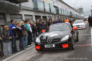 So begann dann um Punkt 12Uhr bei trockener Strecke die Hatz durch die Grüne Hölle. Heiko Eichenberg fuhr einen sehr starken Startturn und katapultierte den SLK auf den 57. Gesamtrang und P4 in der Klasse!!!! Nach acht Runden steuerte er dann die Box an wo der SLK gewohnt routiniert gecheckt wurde und der Fahrerwechsel stattfand. Nun saß Juniorchef Bertin Sing im Auto. Das Team hatte bereits das Podest vor Augen, da sich der Sing-Mercedes gut zwischen P4 und P7 behauptete und Platz 3 in greifbarer Nähe schien. Doch dann begann die Leidenszeit: Kurz vor 14Uhr unterbrach die Rennleitung das Rennen mit der roten Flagge. Im Bereich Tiergarten hatte es einen extrem schweren Unfall mit drei beteiligten Fahrzeugen gegeben.