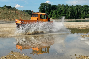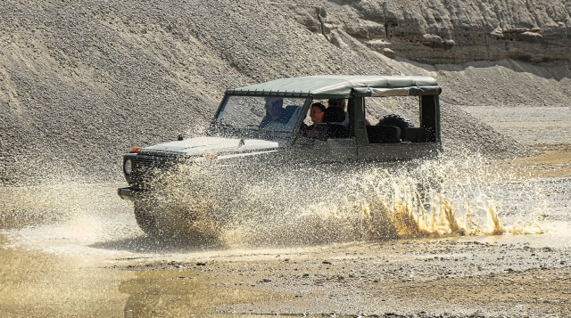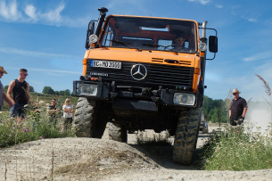 Ein Beispiel dafür ist der erlebnisreiche Tag mit 31 Teilnehmern der Herrmanns GmbH. Ein Unimog, zwei Mercedes-Benz G-Klassen, ein Wolf und zwei ML-Modelle kamen beim Offroad-Training zum Einsatz. Auf Kies- und Sandstrecken, Waldwegen und auf der Piste entlang des Sees gab es zu Anfang eine Einführung in die aufwendige 4x4-Technik, dann das pure Offroaderlebnis mit Steilauf- und Abfahrten, Verwindungsstrecken, Wasser-Passagen und Schrägfahrten.