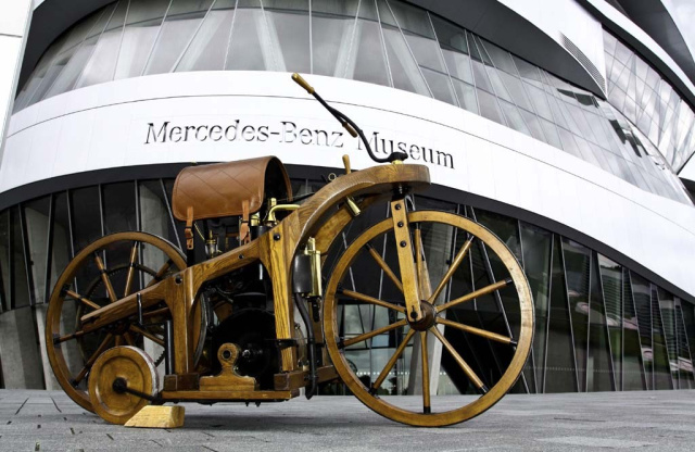 Dass der Erfinder des Automobils am Anfang seiner Erfolgsgeschichte mit zwei Rädern motorisiert in Fahrt kam, weiß nicht jeder. Heute jährt sich die Patent-Anmeldung zur Erfindung des Daimler Reitwagens dem ersten Motorrad der Welt zum 125. Mal. Aus diesem Anlass wurden 120 historische Motorräder auf dem Hügel am Mercedes-Benz Museum in einer Freiluftausstellung präsentiert. Darunter eine Harley Davidson, Original-Nachbau des Filmfahrzeugs aus dem Kultfilm Easy Rider und natürlich ein fahrbereiter Nachbau des berühmten Daimler Reitwagens.