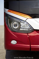 n der Schrägansicht der ComfortClass 500 sticht die geschwungene Aluminiumleiste mit dem neuen Dekor-Element an der B-Säule hervor. Eine leicht ansteigende und abfallende Linienbewegung verläuft rund um das komplett neue Fahrzeug. Im Frontbereich verleiht sie ihr ein freundliches Gesicht, das alle Anforderungen der Aerodynamik mit markanten Linien und weichen Flächen auffängt. Die Konturen wurden erstmals in der Entwicklungs-Geschichte der Neu‑Ulmer Fahrzeuge im konzerneigenen Windkanal in Stuttgart-Untertürkheim getestet und vollendet. Zu einer der sichtbarsten Neuerungen der ComfortClass 500 zählt der neu gestaltete Frontscheinwerfer, der mit serienmäßigem LED-Tagfahrlicht und H7-Abblendlicht bestückt ist. Die neuentwickelten Reflektoren garantieren durch eine erhöhte Ausleuchtung des Fahrzeug-Vorfelds noch mehr Sicherhei