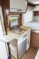 Trotz kompakter Abmessungen bietet der Van S eine Heckgarage mit Ladeklappen auf beiden Seiten und einer optionalen Heckklappe. Obendrein ist der Laderaum auch vom Innenraum aus zugänglich. Die stromsparende LED-Beleuchtung im Innenraum schont die Kapazitäten der Wohnraumbatterie. Die Küchenzeile bietet zahlreiche Schubfächer sowie erweiterbare Arbeitsflächen. Das Sanitärabteil des Van S erlaubt durch das hochklappbare Waschbecken guten Bewegungsraum. Beide Fahrzeuge verfügen serienmäßig über beheizte Frisch- und Abwassertanks mit 100 bzw. 120 Liter Fassungsvermögen.