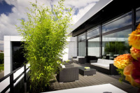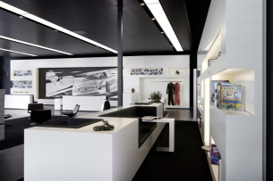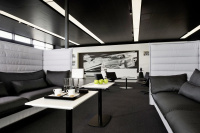 Der in der Mitte der AMG Private Lounge platzierte, sogenannte Silent Space erlaubt eine Kommunikation in privater, doch lockerer Atmosphäre. Daneben befindet sich die Kaffeebar, deren Rückseite mit einem eindrucksvollen, stoffbespannten Fotomotiv ausgestattet ist: Die Fotografie zeigt den SLS AMG auf der Rennstrecke von Paul Ricard in Le Castellet (Südfrankreich) mit ihren markanten, farbigen Auslaufzonen. Der Blick durch die große Fensterfront fällt auf eine 73 Quadratmeter große Terrasse. Auf exklusiven Lounge-Möbeln lässt es sich unter freiem Himmel entspannen oder kommunizieren.