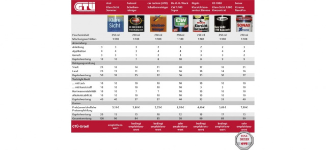 Die GTÜ Gesellschaft für Technische Überwachung hat gemeinsam mit dem ACE Auto Club Europa sieben Sommerscheibenreinigungskonzentrate auf einem speziellen Prüfstand und im Labor getestet und dabei bedenkliche Unterschiede festgestellt. Sieger nach Punkten wurde das Sonax Xtreme 1:100 NanoPro, dicht gefolgt vom cw 1:100 von Dr. Wack, die beide im GTÜ-Test das Prädikat sehr empfehlenswert bekamen (Einzelergebnisse siehe