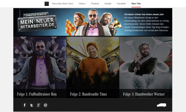 Die Kampagne "Mein neuer Mitarbeiter" ist vor allem auf digitale Kanäle ausgerichtet. Neben einer Verbreitung über Blogs, soll die Kampagne vor allem auch auf Facebook und YouTube für Furore sorgen. Neben den drei Folgen „Mein neuer Mitarbeiter“, in denen Christian Ulmen in ganz neuen Rollen zu sehen ist, findet sich hier auch eine humorvolle interaktive Produktdarstellung des neuen Mercedes-Benz Vito Tourer: In einer seiner Rollen erklärt Christian Ulmen ganz genau, was der Vito Tourer alles zu bieten hat.
